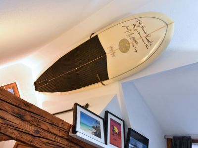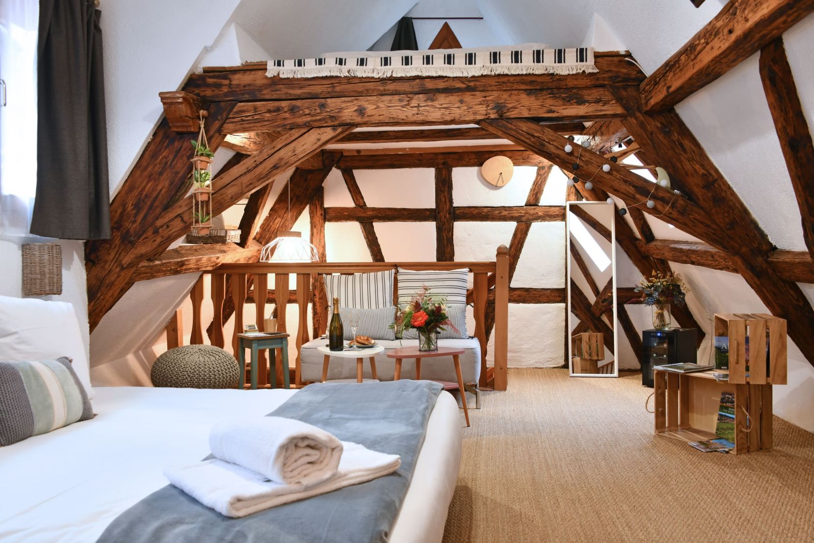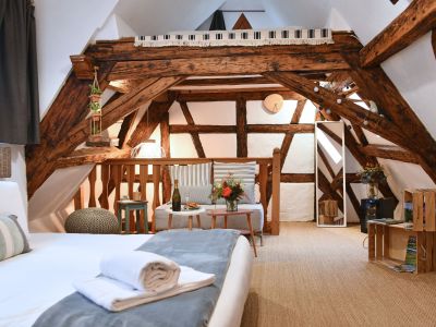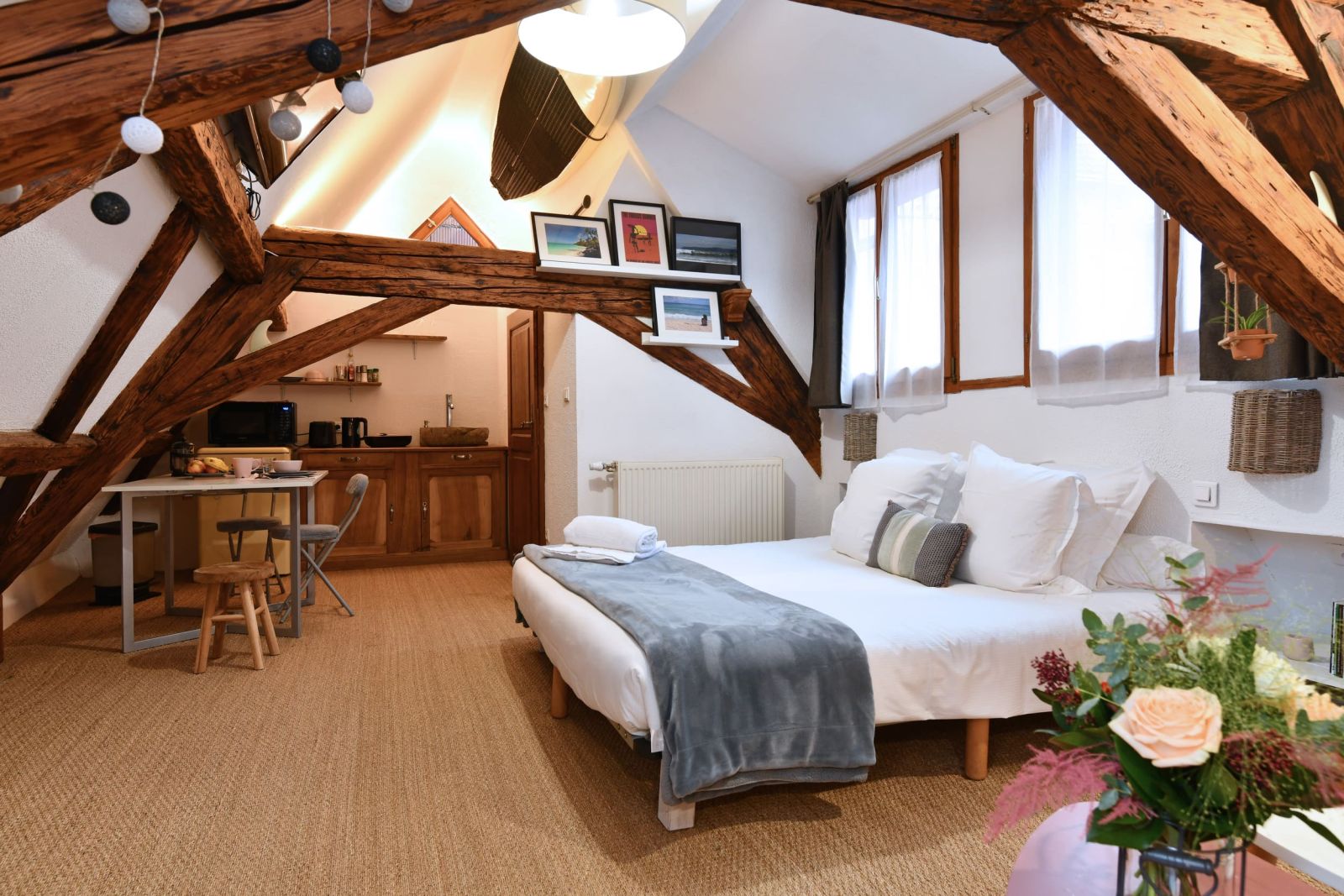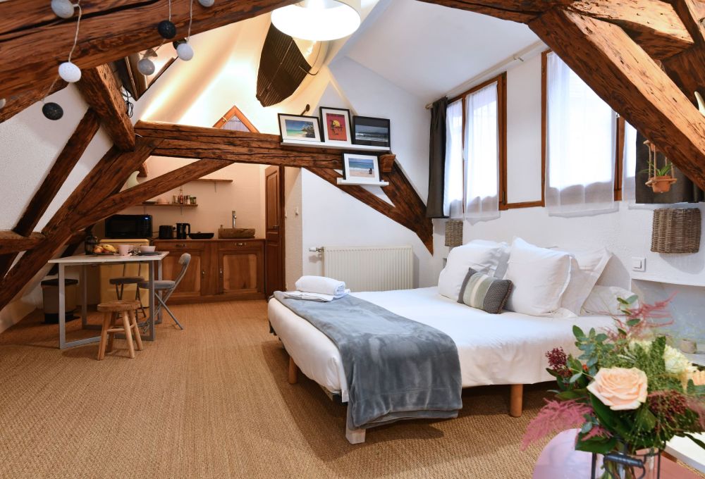 Le Studio Surf est aménagé dans les combles d’une joli maison alsacienne située dans une cour. Il séduit avec ses poutres apparentes et sa décoration originale sur le thème du voyage et du surf. Il est pensé pour accueillir 2 voyageurs, il est cependant possible de faire dormir 2 enfants de plus de 5 ans dans la mezzanine. Le gîte Surf est petit, mais ultra confortable ! Son emplacement est parfait pour explorer Colmar à pied. Il dispose d’une cour intérieure commune, idéale pour manger dehors et ranger les vélos en toute sécurité