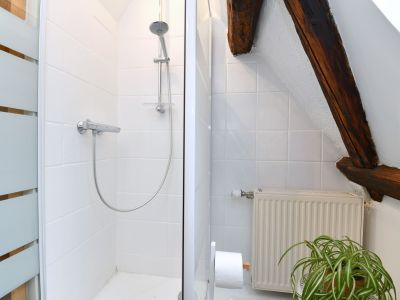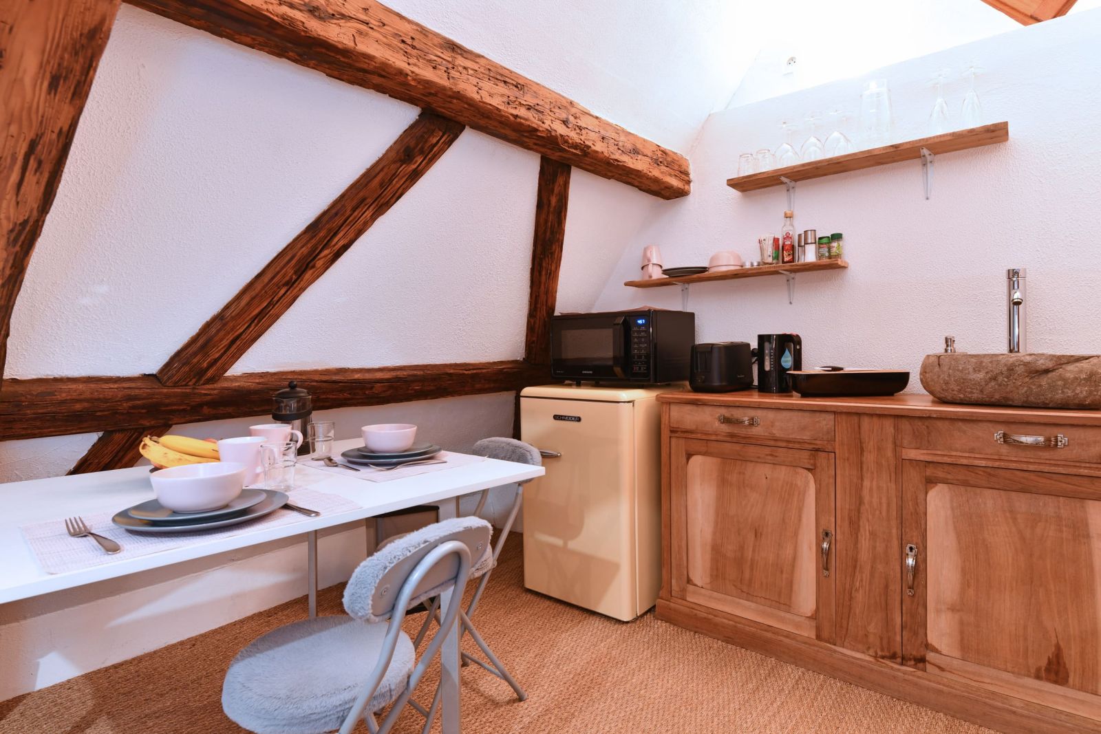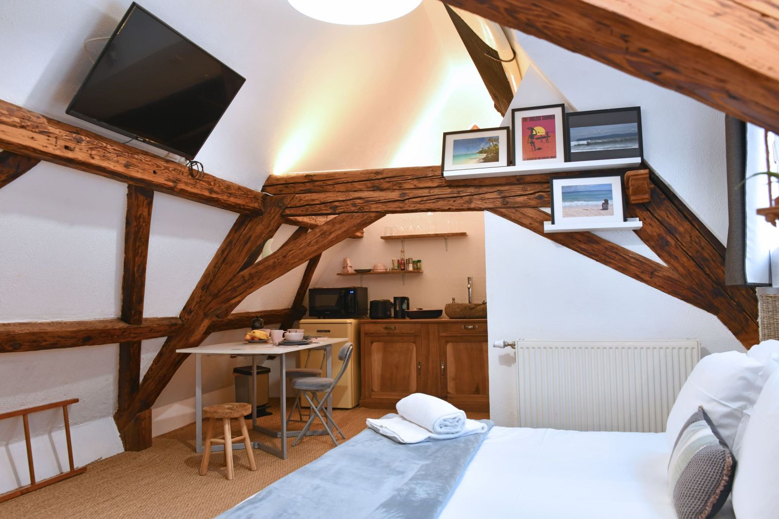 Les poutres apparentes sont basses et la douche est petite, le studio ne convient donc pas aux grands adultes !